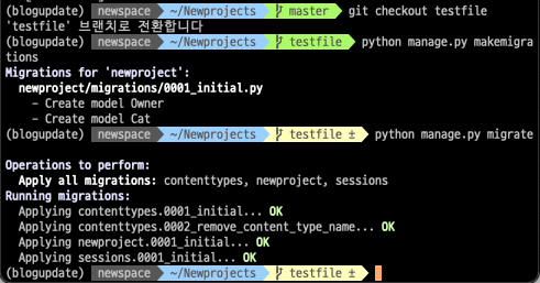 - makemigrations : models.py에 작성한 python code를 database에 적용하기 위한 migration 파일(설계도)를 만드는 과정