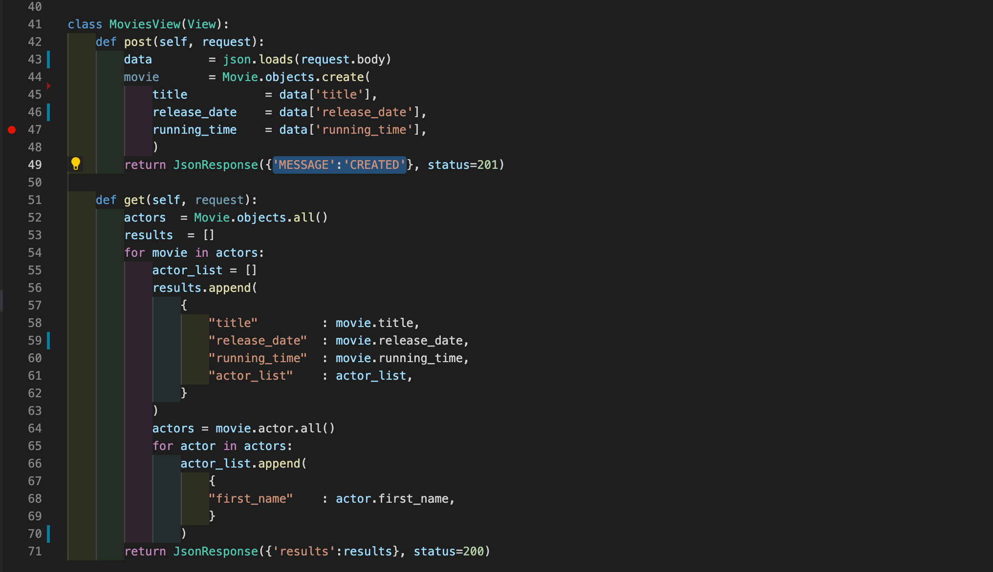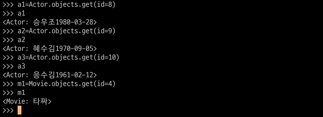 - get을 이용해 id값을 불러와서 Actor와 Movie를 넣어주고 확인합니다.