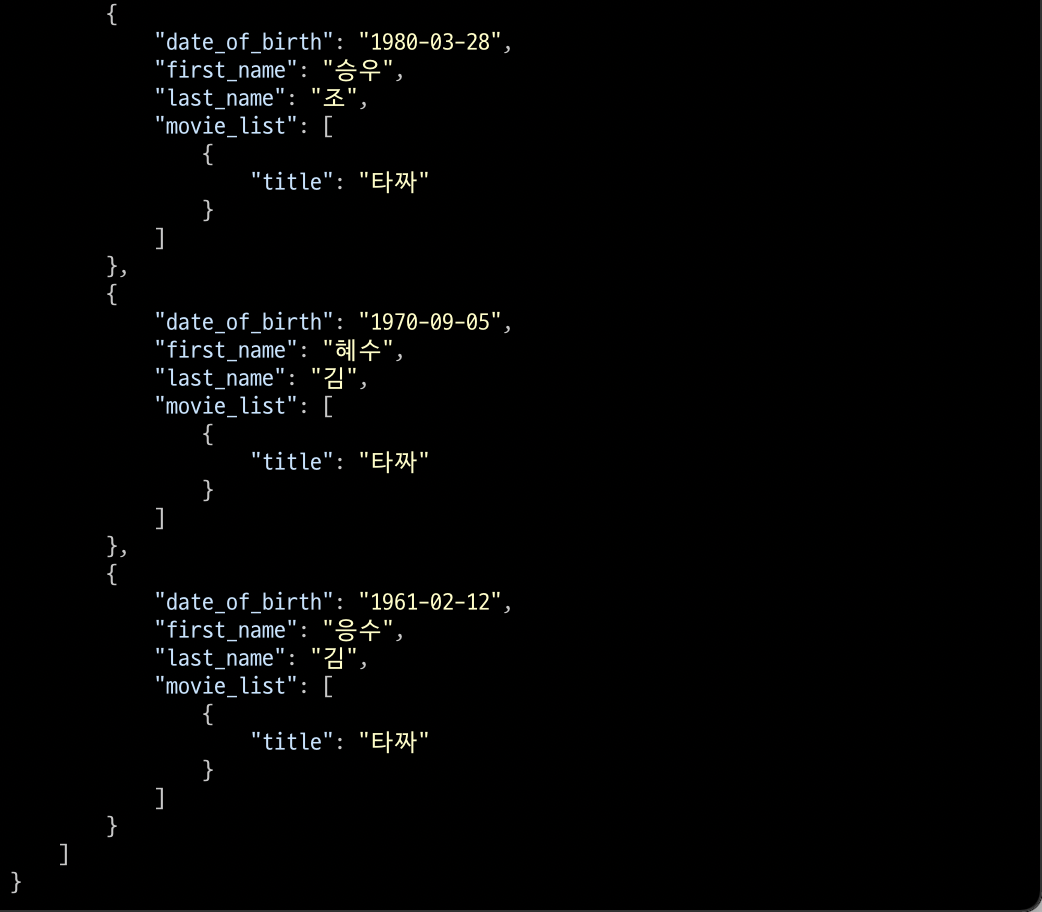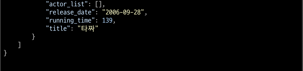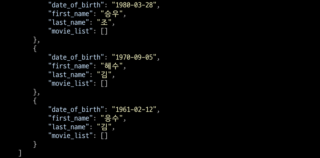 ★ views.py에서 #주석 처리했던 actor_list, movie_list는 ManytoMany를 참조하여 중간 테이블에 id값을 불러와서 서로를 부를 수 있게 만들어줍니다. (주석을 지우면 이렇게 표현됩니다.)