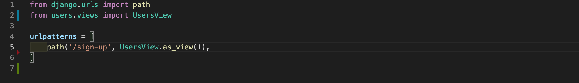 ※ 클라이언트의 요청을 받아서 회원가입 뷰를 호출할 수 있도록 urls.py를 작성해야 합니다.