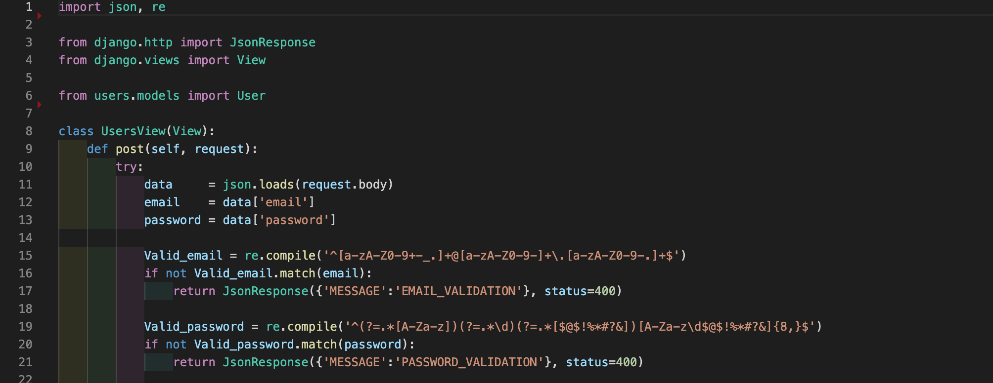 이후 정규표현식을 사용하기 위하여 python에서 지원하는 re모듈을 import 해주고 email과 password의 조건의 부합하게 코드를 기입합니다.