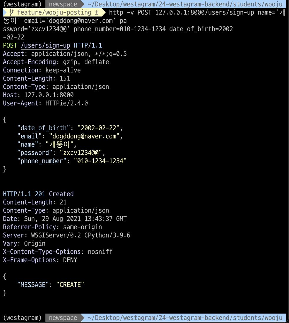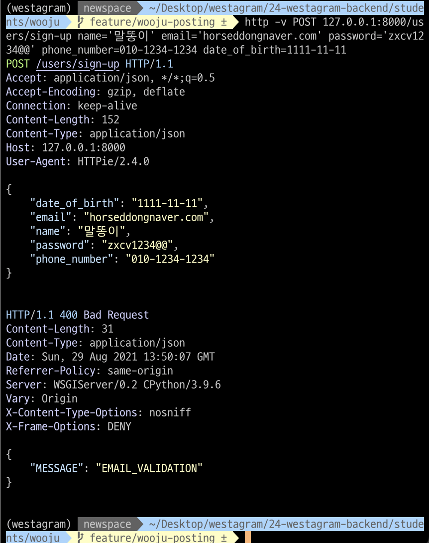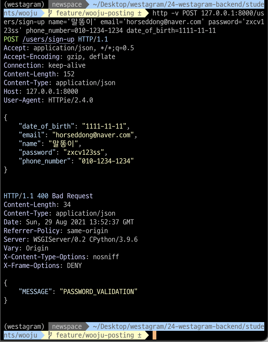 ※ httpie -v POST를 이용해 회원가입 및 오류 확인