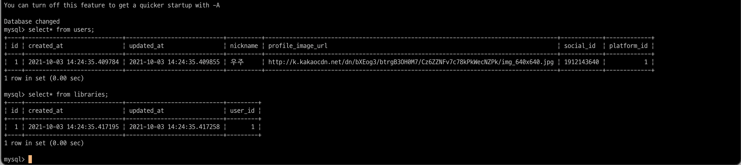 - 본 프로젝트는 향후 확장성을 고려해 플랫폼을 나누어서 모델링하였습니다.(id=1에 kakao라는 플랫폼을 저장해둠)
