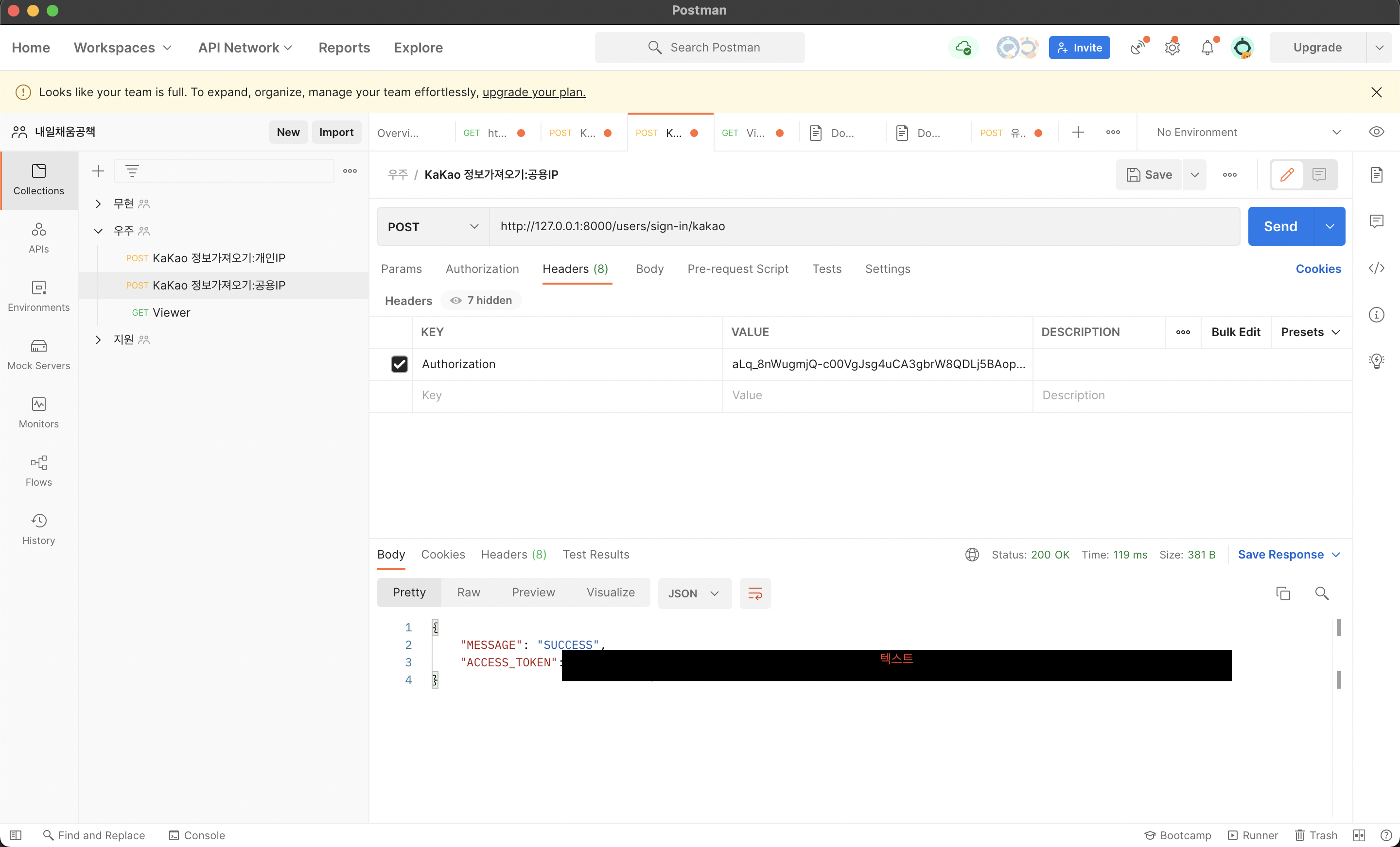- post method로 access_token이라는 변수를 지정해 헤더로 받아서 "Authorization"으로 인가 토큰으로 받아줍니다.