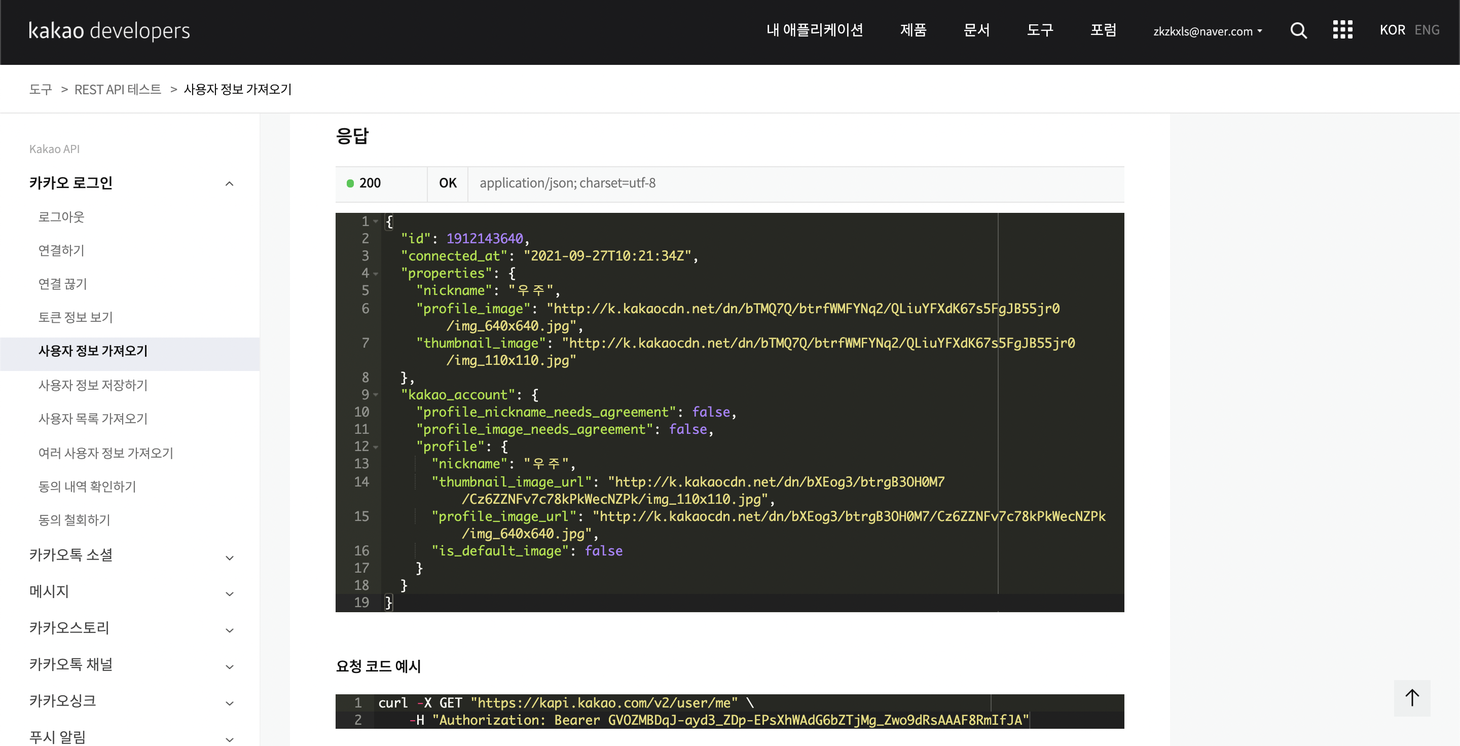 - 토큰을 발급하고 전송을 누르면 우리가 필요로 하는 카카오 정보를 json 형태로 주게 된다.