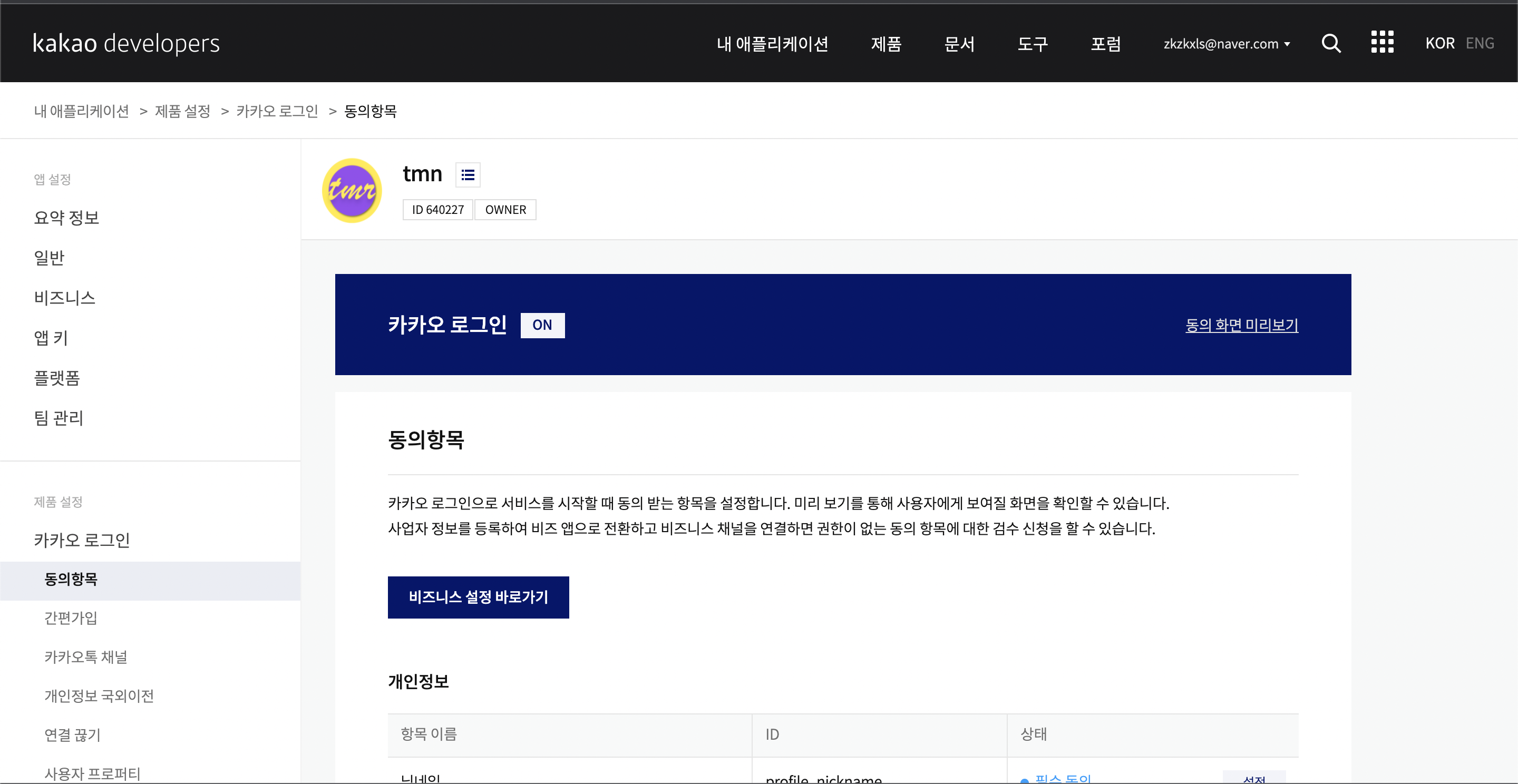 ★ 위의 tnb처럼 자신의 애플리케이션을 가지고 원하는 정보를 가져오고싶다면, 내 어플리케이션을 들어가서 만들어주고 카카오 로그인 동의 항목을 바꿔주면 된다.