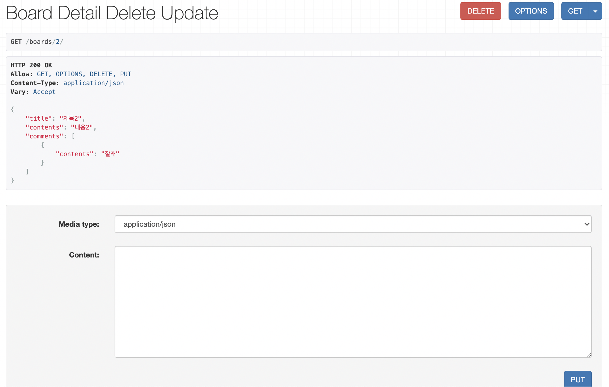 이어서 127.0.0.1:8000/boards/1로 가면 1번 게시글과 댓글이 나오며 DELETE와 PUT이 가능합니다.