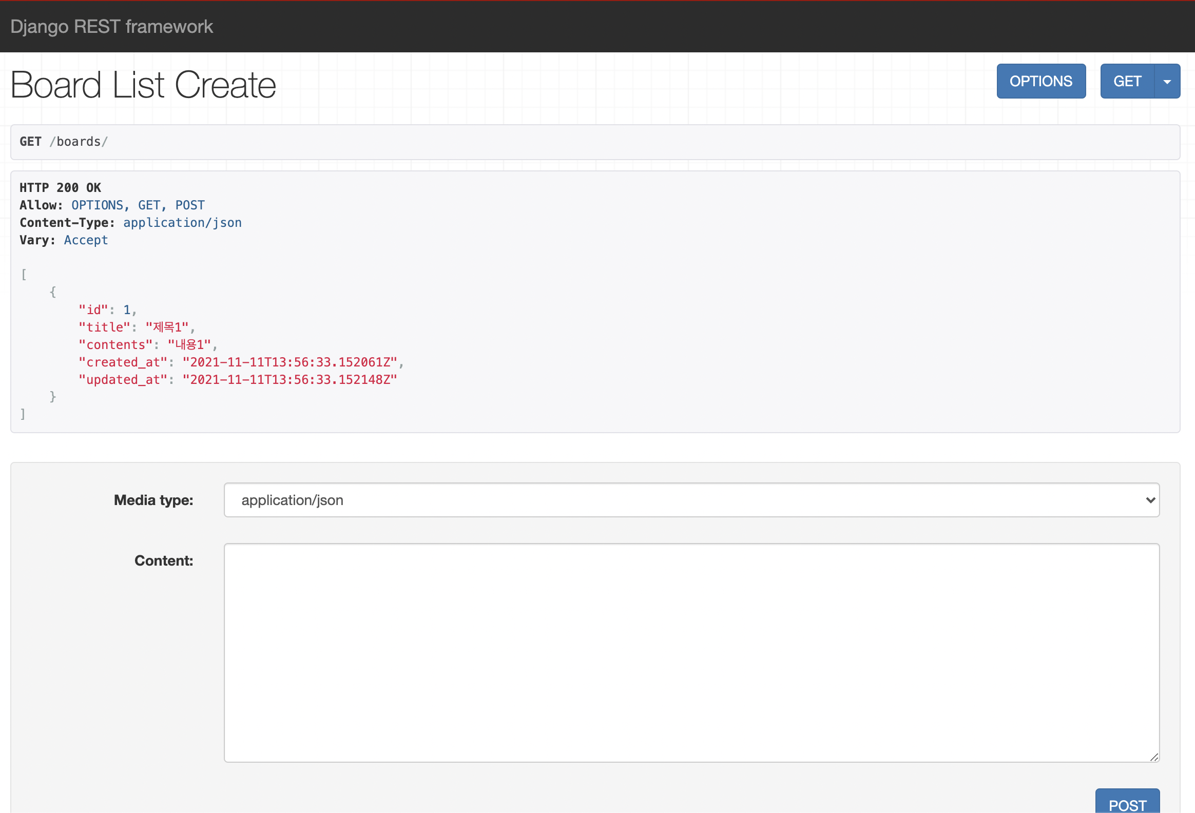 파이썬 기본 지정 서버인 127.0.0.1:8000에서 우리가 지정해준 /boards를 타고 가면 아래의 사진과 같은 화면을 볼 수 있다.
