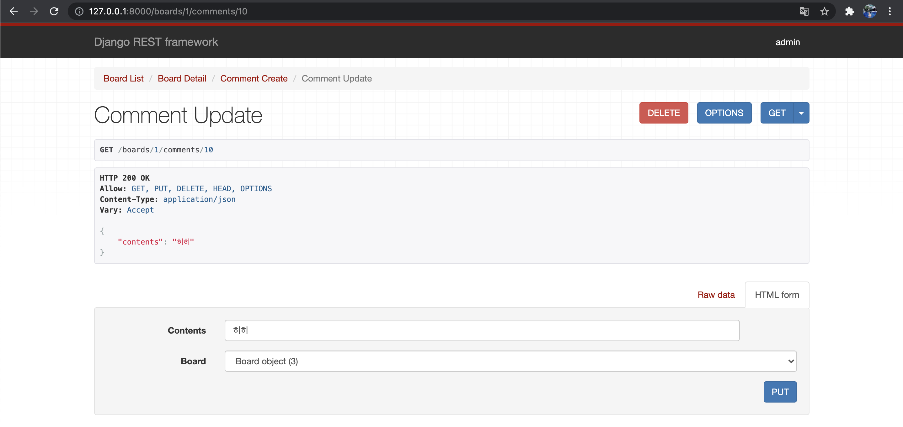# 편의를 위해 댓글의 id값을 불러오고 게시글의 pk값을 불러오는 'board'를 삭제합니다.