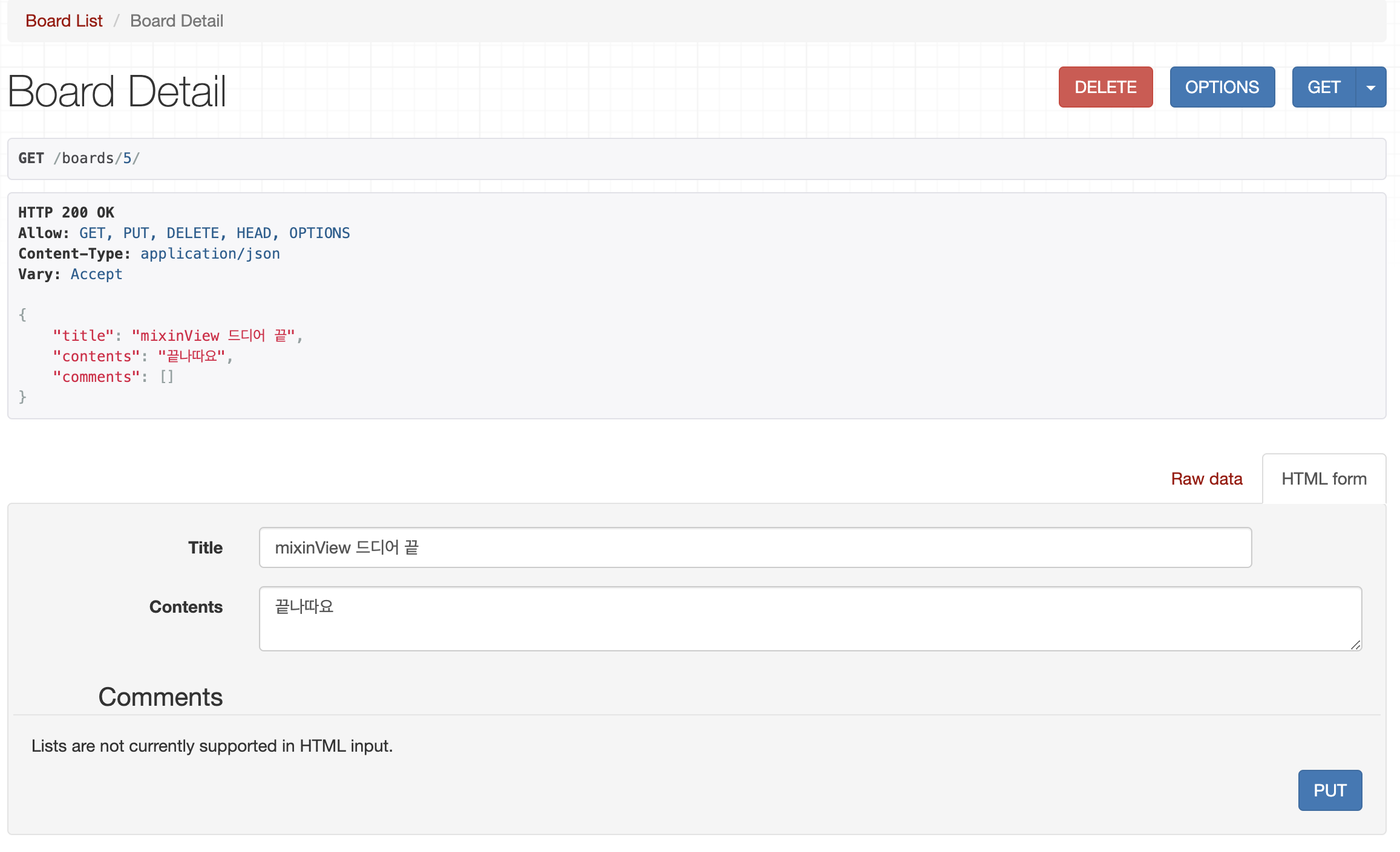 여기서 perform_create에서 save()할 때 값을 지정해줄 수 있기에 댓글 생성 시 보드의 pk를 받아와야 하기에 pk값을 지정해주었습니다.